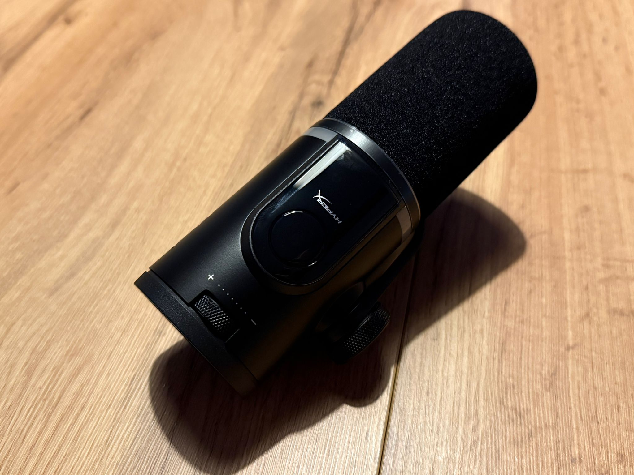 FlipCast wygląda jak sprzęt z pogranicza świata gamingowego i półprofesjonalnego audio: ma cylindryczną, matową bryłę, mocno przypominającą popularne mikrofony z segmentu broadcast, ale z wyraźnym „hyperxowym” akcentem w postaci RGB i panelu LED. Konstrukcja jest solidna i dobrze spasowana, a uchwyt montażowy ze śrubą daje poczucie pewnego mocowania bez zbędnej gimnastyki przy instalacji.