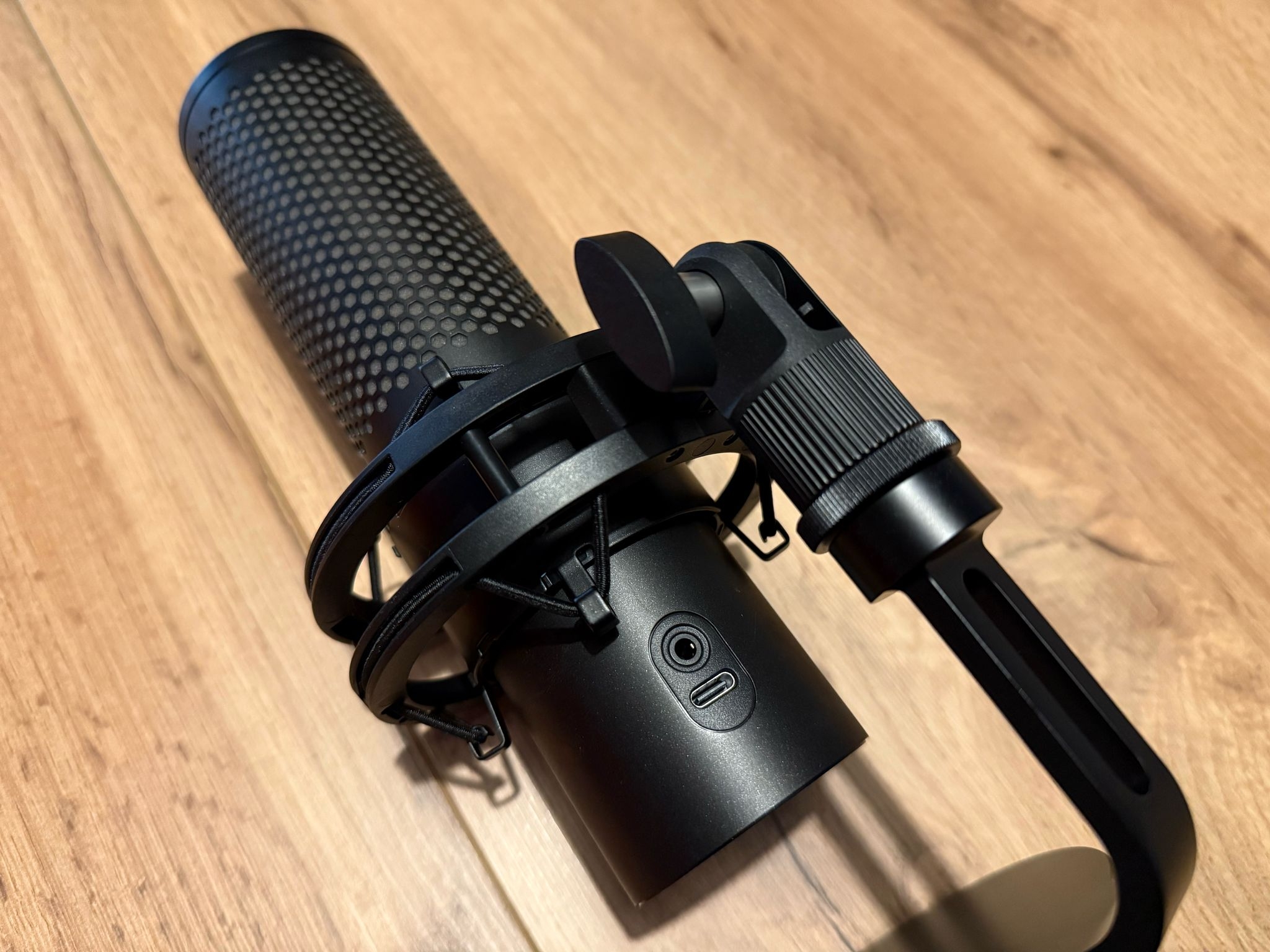 Z tyłu HyperX Quadcast 2S umieszczono port USB-C oraz mini jack 3,5 mm. Port USB służy do komunikacji urządzenia z komputerem. Port jack wykorzystamy do podłączenia słuchawek jako nasłuchu. Przewody można wygodnie przeprowadzić przez dedykowany otwór w statywie.