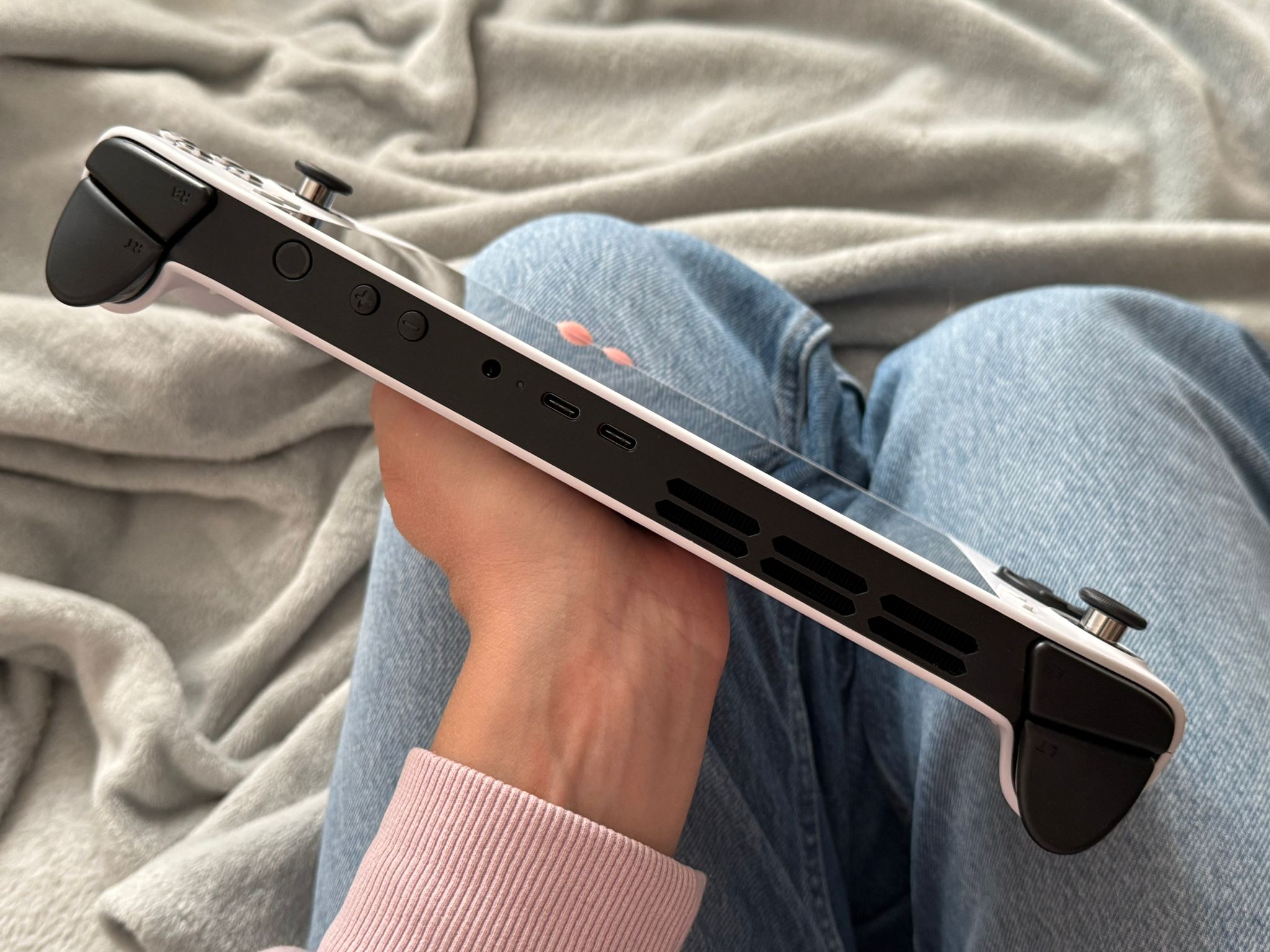 Legion Go S, choć lżejszy i bardziej „szczupły” od brata, zachowuje pełną ergonomię – układ przycisków i drążków nie powoduje zmęczenia nawet przy mniejszych dłoniach.