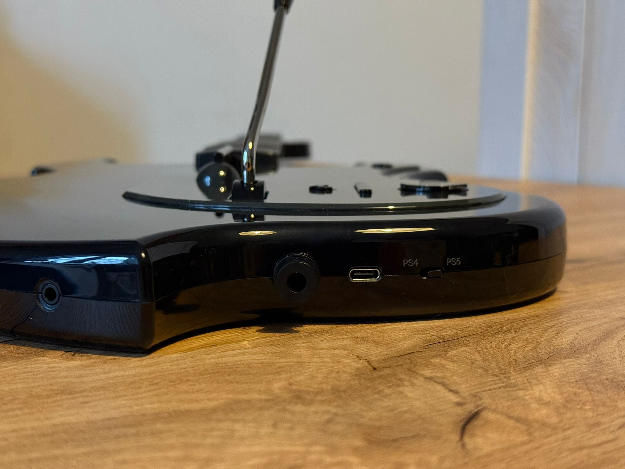 Gniazdo jack 3,5 mm pozwala podpiąć słuchawki i grać „po cichu”, z pełnym audio oraz mikrofonem przez gitarę. Głośność i balans (gra/czat) można regulować za pomocą D‑pada i przycisku funkcyjnego – wymaga to nauczenia się kombinacji, ale później jest bardzo wygodne. Port audio działa stabilnie, bez trzasków czy gubienia kontaktu. Takim trochę irytującym szczegółem jest to, że gitara nie potrafi sama wybudzić konsoli – PS5 trzeba włączyć padem albo przyciskiem na obudowie, dopiero potem przejąć sterowanie Riffmasterem.