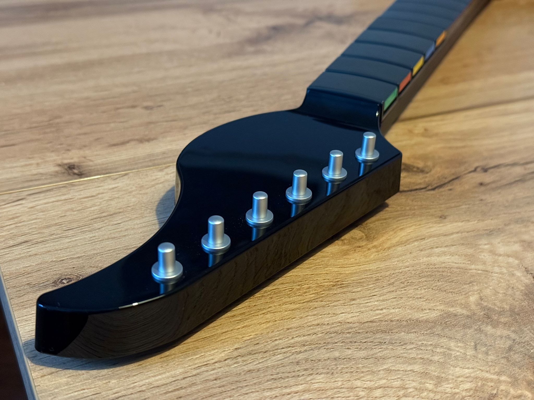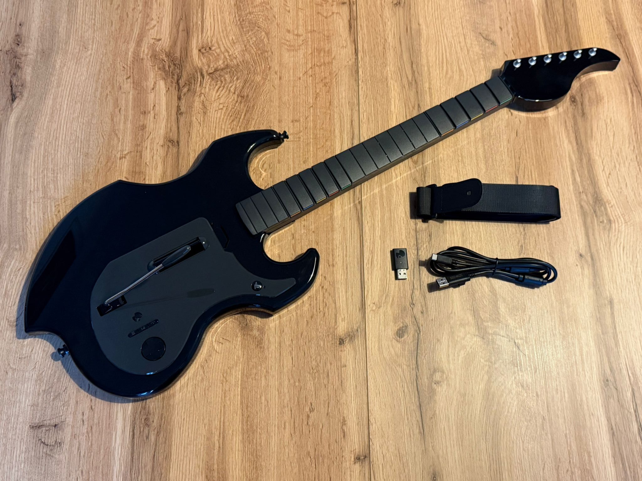 - Układ przycisków: dwa zestawy progów (główne przy kluczach i dodatkowe przy korpusie), struna (strum bar), wajcha tremolo (whammy), przyciski PlayStation, Options, Share, przycisk funkcyjny, dedykowany P1 (domyślnie R3), D‑pad oraz joystick z tyłu gryfu.