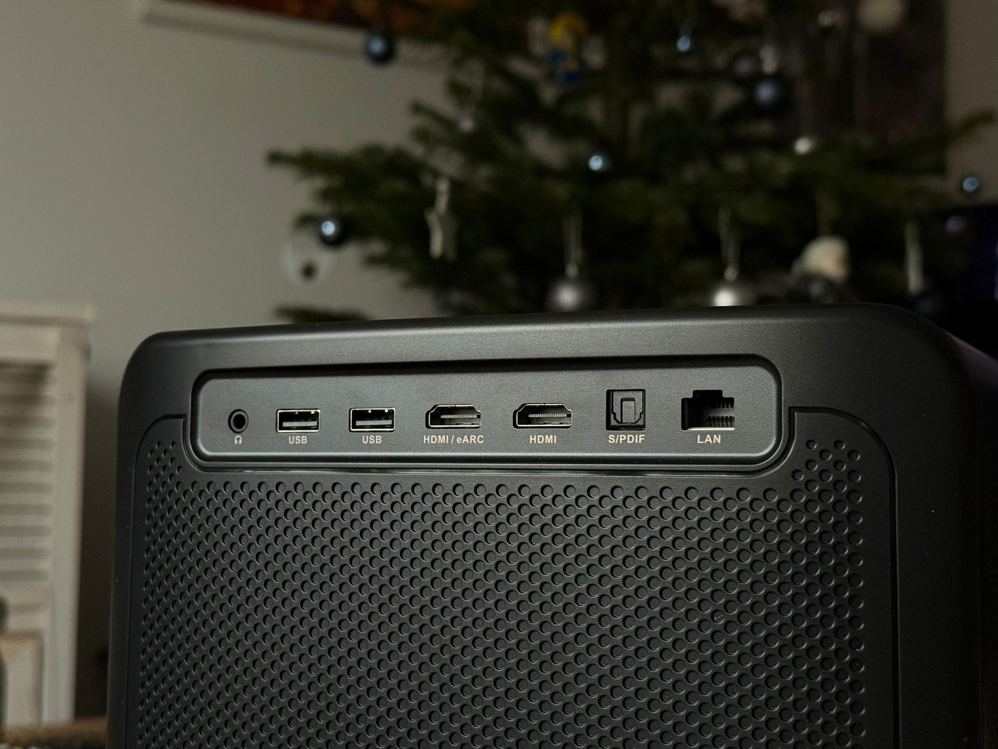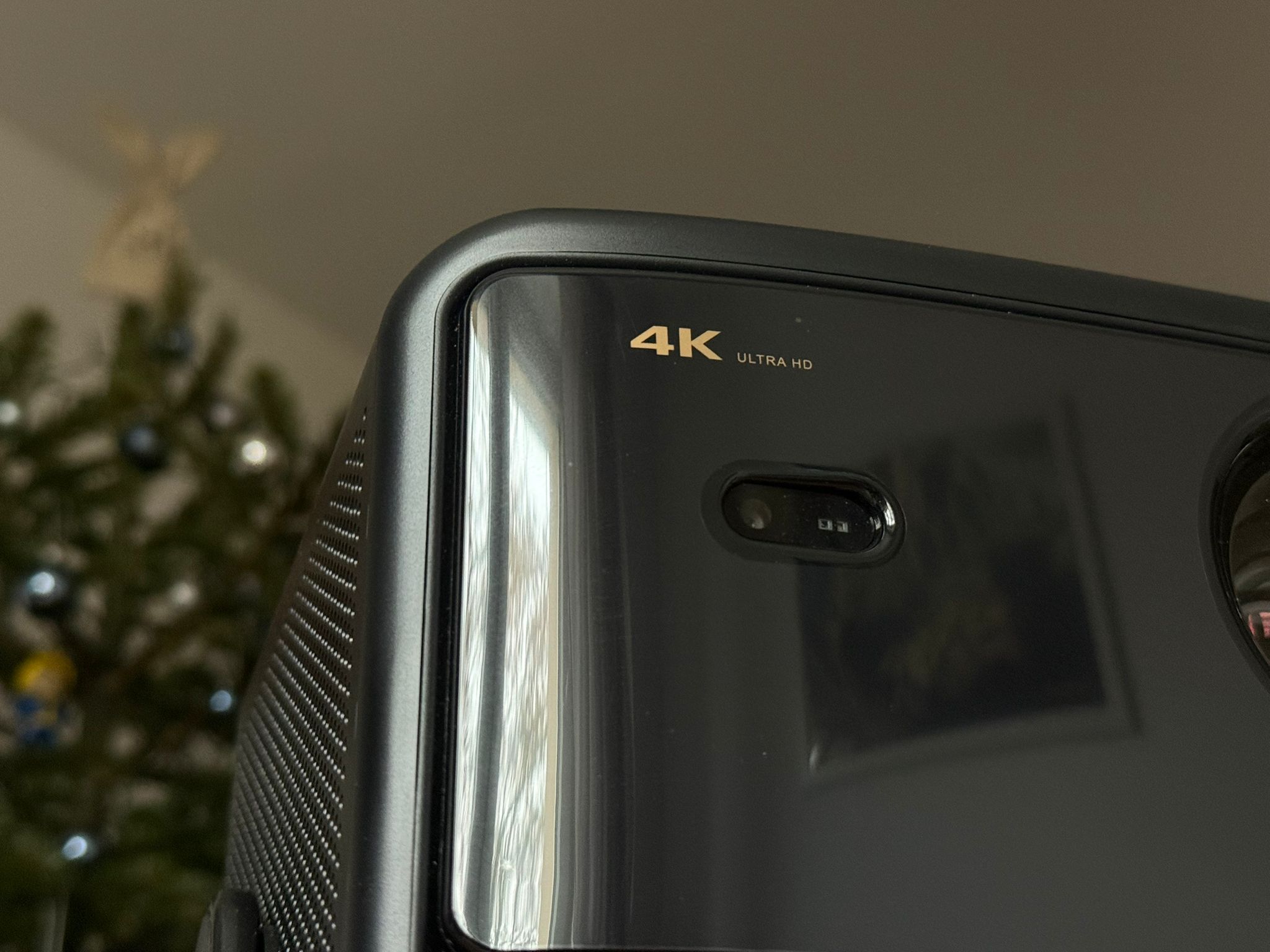 Błyszczący front i góra sprzyjają łapaniu odcisków palców oraz kurzu z powietrza. Na samym projektorze brak klasycznego panelu przycisków – sterowanie możliwe jest praktycznie tylko pilotem (lub Google TV przez telefon).​
