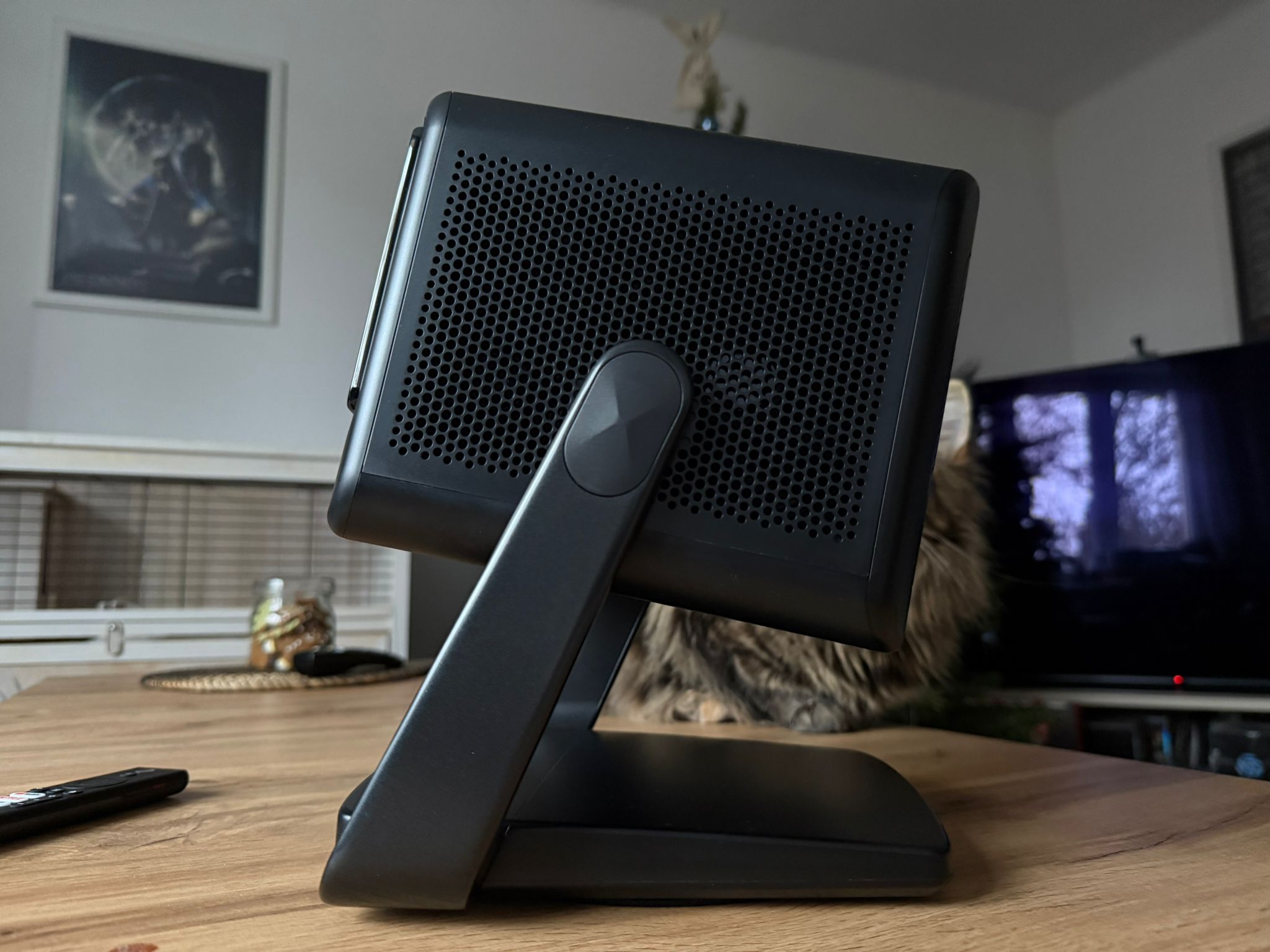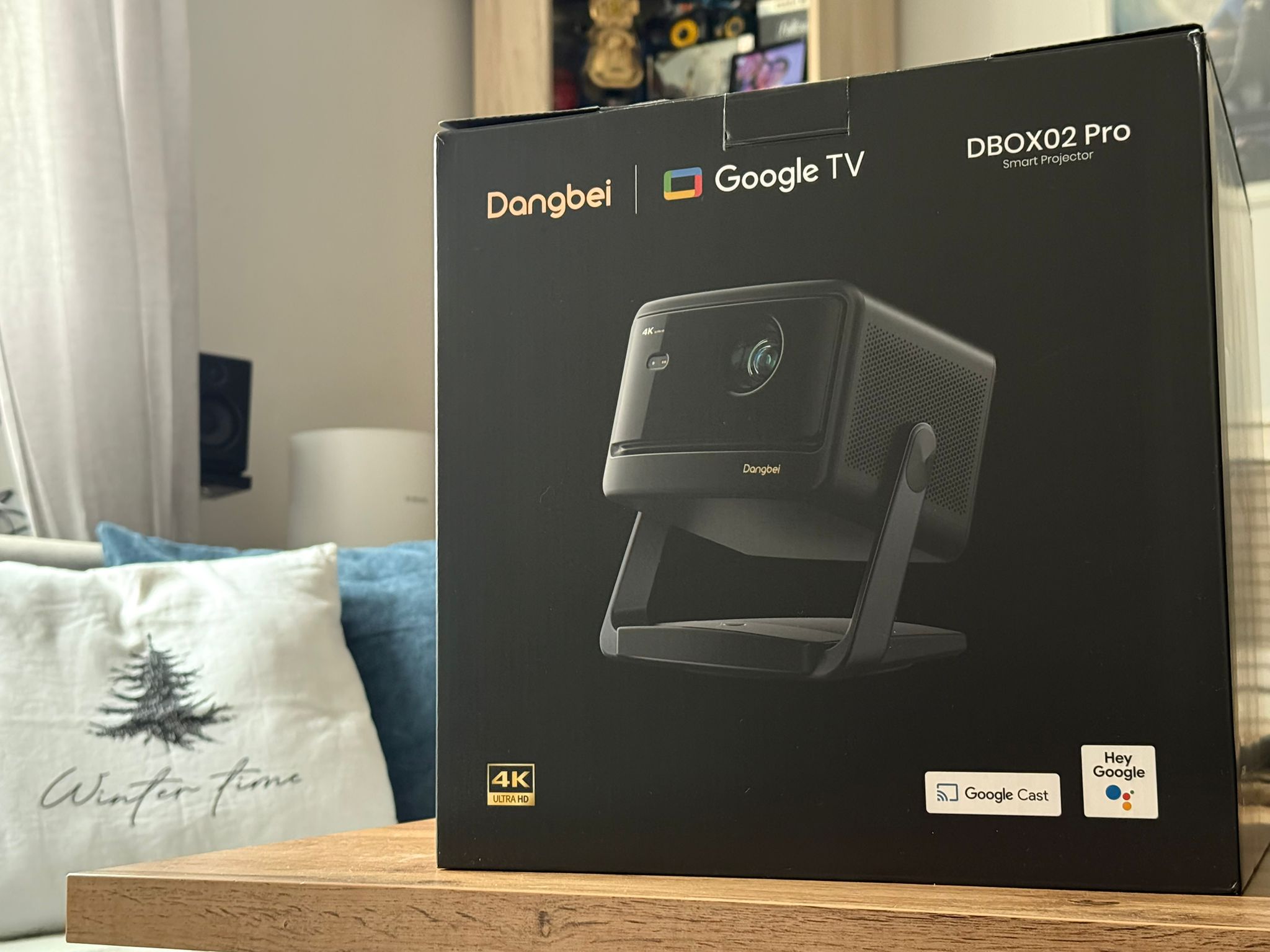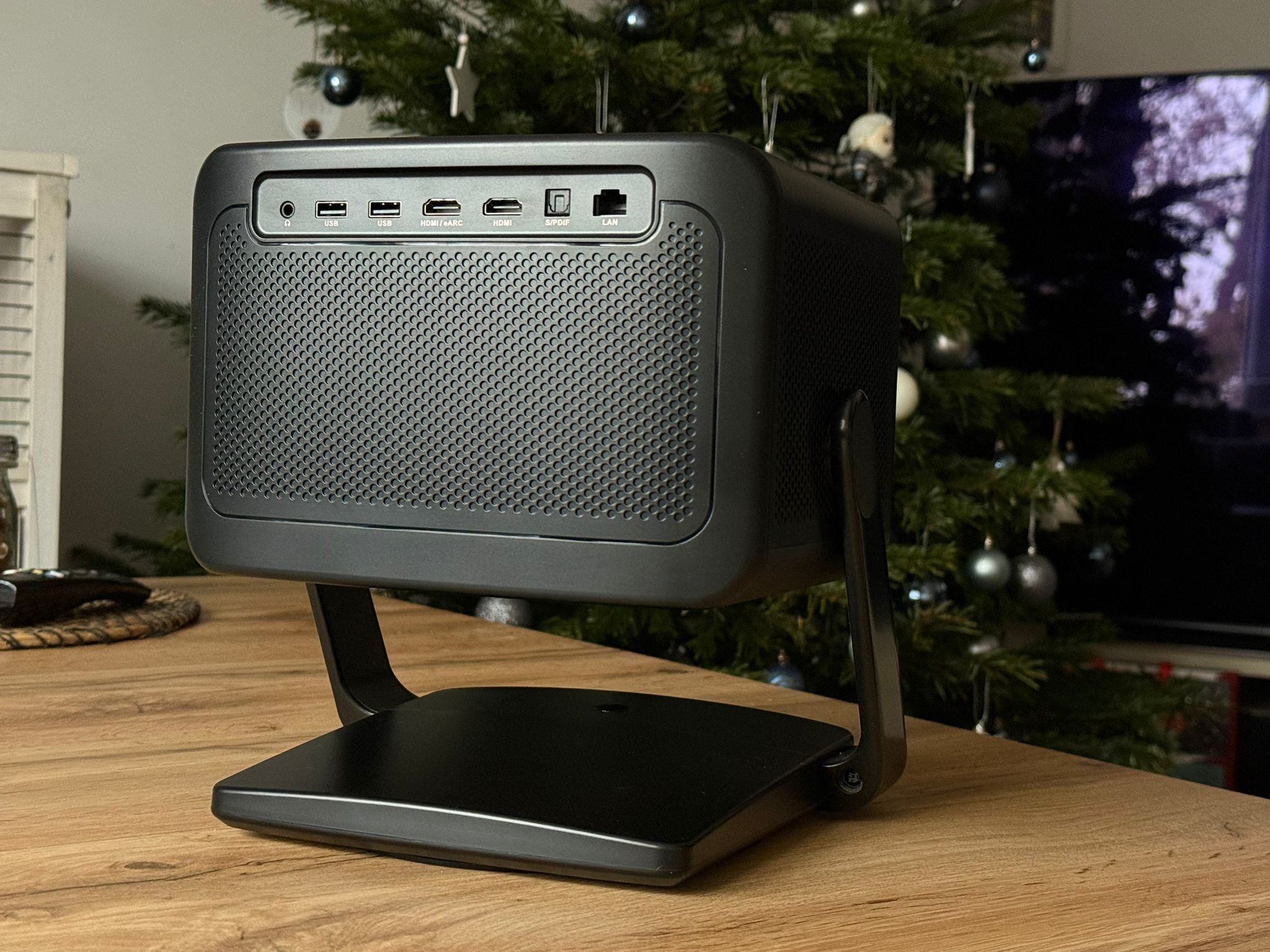 DBOX02 Pro ma bardzo „salonowy” wygląd: matowy, szaro‑czarny prostopadłościan z aluminiową obudową i błyszczącym frontem oraz górą, który łatwo wpasować w wystrój pokoju. To typowy „lifestyle cube” jak Hisense C1 czy XGIMI Horizon Ultra – kompaktowy (ok. 262 × 246 × 215 mm), ale nie typowo mobilny „pikoprojektor”.​ W modelu tym znajdziemy także wbudowaną obrotową podstawę‑gimbal, która pozwala na obracanie projektora o 360° i odchylanie w pionie o ~120°, co pozwala na postawić go na stoliku i w kilka sekund ustawić obraz na ścianie czy suficie.​