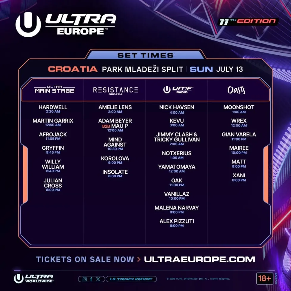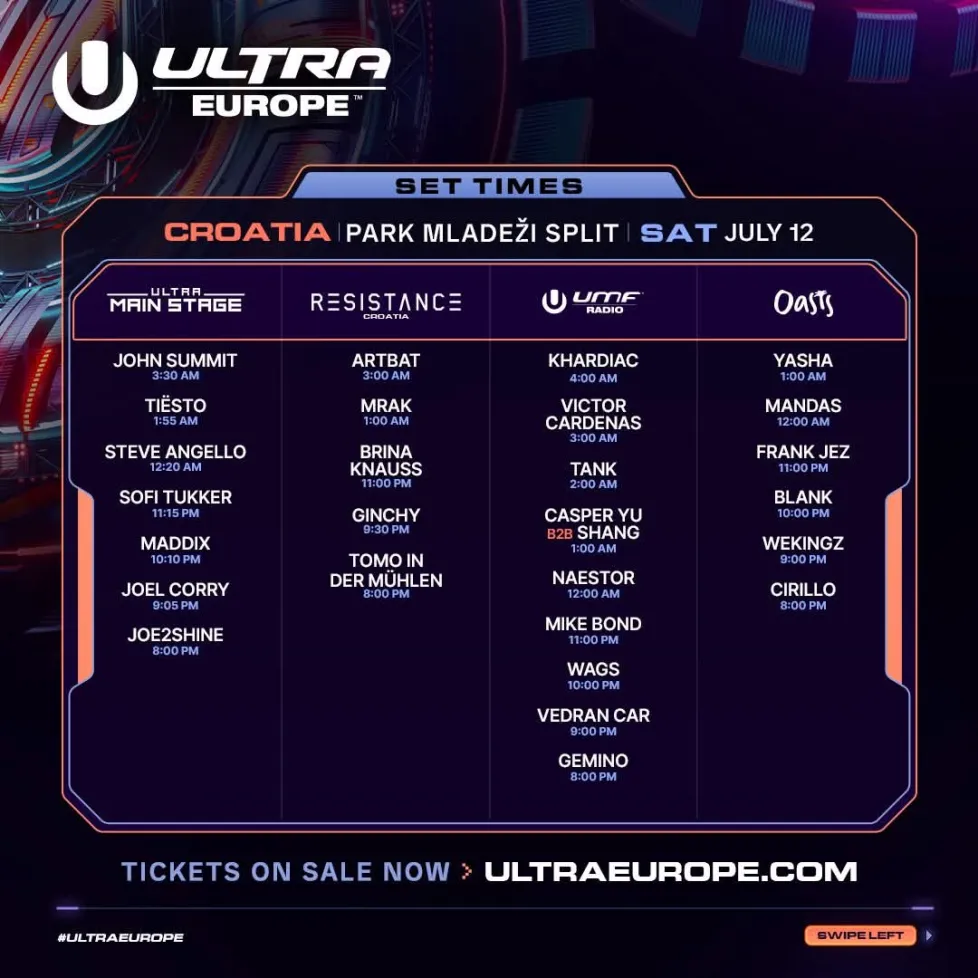 Tegoroczna edycja Ultra Europe odbędzie się w dniach 11–13 lipca 2025 roku w Parku Mladeži w Splicie. Festiwal, będący jednym z największych wydarzeń muzyki elektronicznej w Europie, po raz kolejny przyciągnie do Chorwacji dziesiątki tysięcy fanów i czołówkę światowych DJ-ów. Organizatorzy przygotowali bogaty harmonogram rozłożony na cztery sceny: Main Stage, Resistance, UMF Radio oraz Oasis.